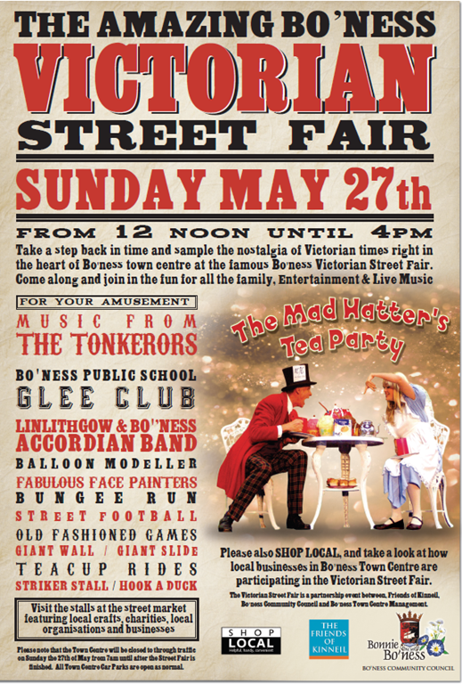 THE Friends of Kinneil charity – www.kinneil.org.uk/friends – will be taking a fundraising stall at this Sunday’s Victorian Street Fair in Bo’ness Town Centre. The event is free and kicks off at noon. Come along and join in the fun.