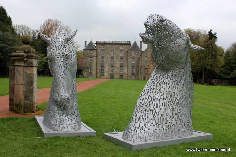 Fifteen foot models of the Kelpies – the giant equine sculptures dominating the new Helix park in Falkirk – were positioned by Kinneil House and Museum, prompting a rush for cameras and phones to take "Kelpie Selfies".